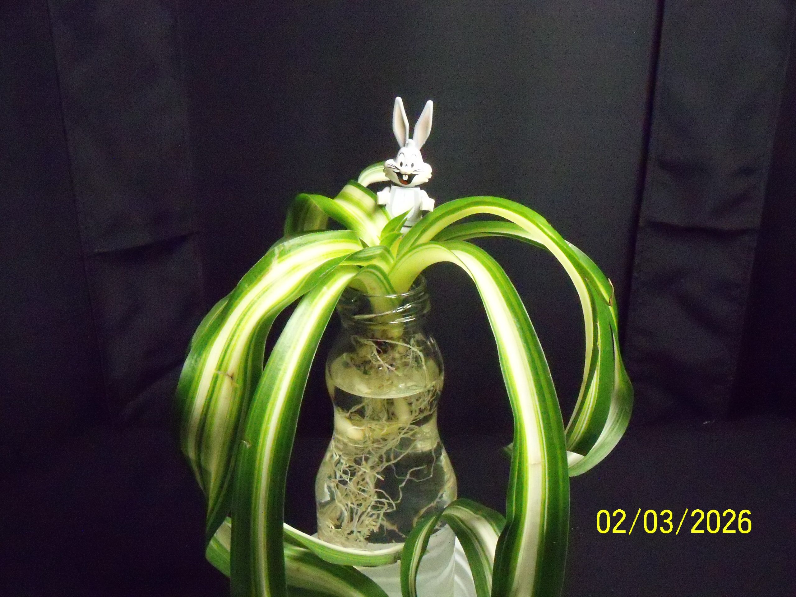 This Curly Spider Plant was purchased on the 24Feb26 at the same time as the Peace Lily, the roots were soaked a few days to remove the soil, then it was tried in another container but didn’t really suit that, so now moved to this jar temporarily.