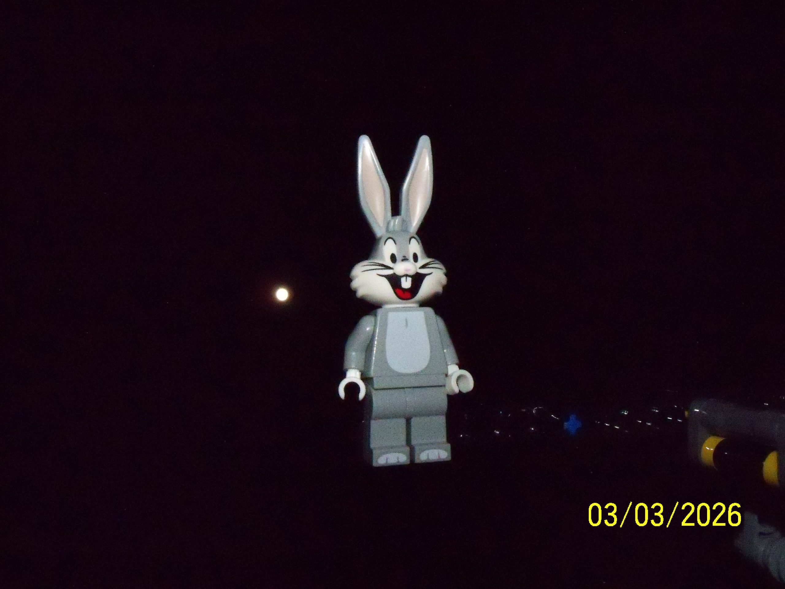 Attempted photographs of Bugs with the earth’s moon. It demonstrates the depth of field challenges with the camera, plus the scale of the moon that our minds always perceives as larger than it is.